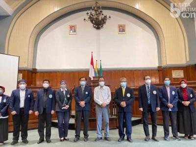 SURABAYA - 56 guru besar (gubes) Fakultas Kedokteran (FK) Unair memberikan rekomendasi penanganan pandemi Covid-19 di Indonesia agar bisa segera dilakukan untuk mengantisipasi dampak kasus kematian yang masih tinggi. Rekomendasi yang tertuang dalam Gerakan Aksi Bersama Serentak Tanggulangi Covid-19 (Gebrak Covid-19) yang digelar di Aula FK Unair, Jumat (30/7), diikuti oleh 750 peserta secara daring (online) melalui fasilitas zoom.  Dekan FK Unair, Prof Dr. dr. Budi Santoso, Sp.OG menjelaskan bahwa rekomendasi ini lahir dari kekhawatiran para guru besar FK Unair mengenai situasi pandemi saat ini yang semakin mengkhawatirkan, baik di tingkat masyarakat hingga fasilitas pelayanan kesehatan.