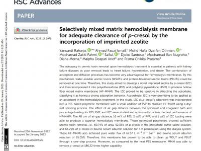 Abstract The adequacy in uremic toxin removal upon hemodialysis treatment is essential in patients with kidney failure diseases as poor removal leads to heart failure, hypertension, and stroke. The combination of adsorption and diffusion processes has become very advantageous for hemodialysis membranes. By this mechanism, water-soluble uremic toxins (WSUTs) and protein-bounded uremic toxins (PBUTs) could be removed at one time. Therefore, this study aimed to develop a novel imprinted zeolite by p-cresol (IZC) and then incorporated it into polyethersulfone (PES) and poly(vinyl pyrrolidone) (PVP) to produce hollow fiber mixed matrix membrane (HF-MMM). The IZC proved to be sensitive in attracting the adsorbate, classifying it as having a strong adsorption behavior.