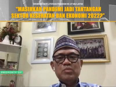 Surabaya. MUI Jatim. Majelis Ulama Indonesia (MUI) Jawa Timur (Jatim) kembali melaksanakan agenda rutin ‘Webinar Seri Literasi Pandemi’ Jum’at (14/01/2022). Pada seri ke-27 ini yang menjadi tema adalah ‘Masihkan Pandemi Jadi Tantangan Sektor dan Ekonomi 2022?’. Dalam sambutan pengantar, Ketua Badan Kesehatan MUI Jatim Djoko Santoso menuturkan organisasinya telah sepakat melakukan penguatan singkronisasi antara kesehatan dan ekonomi. “Sehingga keduanya harus kita maknai atau mengerti secara mendalam tantangan pandemi yang sudah dua tahun berjalan dengan berbagai varian. Yang terakhir adalah varian Omicron,” katanya. Sudah lebih dari 150 negara yang menerima varian-varian ini dengan kebijakan masing-masing negara. Tergantung dari kemampuan defisa negaranya.