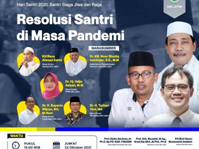 Webinar Seri Literasi Pandemi MUI Jatim Spesial Hari Santri  “Resolusi Santri di Masa Pandemi” Hari : Jum'at, 22 Oktober 2021 Pukul : 19.00 WIB  Sambutan PengarahanKH. Moh. hasan Mutawakkil Alallah, S.H., MM. (Ketua Umum MUI Jatim) PengantarProf. Djoko Santoso, dr. Ph.D, Sp.PD. KGH. FINASIM (Ketua Badan Kesehatan MUI Jatim) Pemateri:1. KH. Reza Ahmad Zahid (Ketua Komisi Dakwah MUI Jatim)2. Dr. KH. Noor Shodiq Askandar, S.E., M.M (Ketua Komisi Pemberdayaan Ekonomi Umat MUI Jatim)3. Dr. Hj. Udjie Asiyah, M.Si (Ketua Komisi Pemberdayaan Perempuan, Keluarga, dan Remaja MUI Jatim)4. Dr. H. Suparto Wijoyo, S.H., M.Hum (Ketua Lembaga Pemuliaan Lingkungan Hidup - SDA MUI Jatim)5. Dr. H. Turhan Yani, MA (Ketua Komisi Pendidikan dan Kaderisasi Ulama MUI Jatim) Moderator: Dr. Hj. Muslihati, S.Ag., M.Pd Link Zoom: https://us02web.zoom.us/j/87812764039?pwd=RmIrMUhzd3B1bDJzL2Z3UkxHNXRwdz09Meeting ID: 878 1276 4039Passcode: MUIJTM Form pendaftaran peserta: https://bit.ly/DaftarWebinarMUISpesialHariSantri