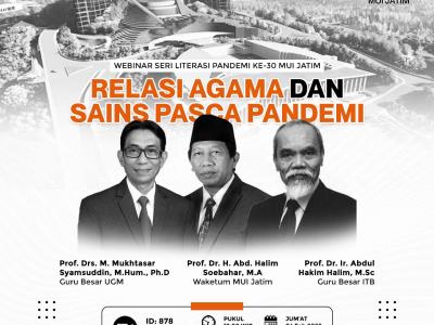 Webinar Seri Literasi Pandemi ke-30 MUI Jatim Tema “Relasi Agama dan Sains Pasca Pandemi” Jum'at, 04 Februari 2022Pukul 19.00 WIB Sambutan DP MUI JatimProf. Akh. Muzakki, M.Ag.,Grad.Dip.SEA.,M.Phil., Ph.D (Sekretaris Umum MUI Jatim) Pengantar DiskusiProf. Djoko Santoso, dr. Ph.D, Sp.PD. KGH. FINASIM (Ketua Badan Kesehatan MUI Jatim) Narasumber1. Prof. Dr. H. Abd. Halim Soebahar, M.A (Waketum MUI Jatim)2. Prof. Dr. Ir. Abdul Hakim Halim, M.Sc (Guru Besar ITB)3. Prof. Drs. M. Mukhtasar Syamsuddin, M.Hum., Ph.D (Guru Besar UGM) Link Zoom: https://bit.ly/WebinarSeriLitaresiPandemiMUIJATIMMeeting ID: 878 1276 4039Passcode: MUIJTM Form pendaftaran peserta: https://bit.ly/DaftarWSLP30