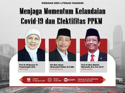 Webinar Seri Literasi Pandemi Ke-9 MUI JatimTema: Menjaga Momentum Kelandaian Covid-19 dan Efektivitas PPKMSambutan PengarahanKH. Moh. Hasan Mutawakkil Alallah, S.H.,MM.Ketua Umum MUI JatimHost dan Pengantar ZoominarProf. Djoko Santoso, dr. Ph.D, Sp.PD. KGH. FINASIMKetua Badan Kesehatan MUI JatimNarasumber:1. Prof. Dr. Mohammad Mahfud MD, S.H., S.U., M.I.P.Menkopolhukam RI2. Prof. Dr. Ni Nyoman Tri Puspaningsih, M.SiPeneliti SeniorJum'at, 27 Agustus 2021Pukul 19.00 WIB