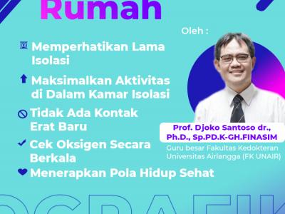 UNAIR NEWS – Penting bagi kita untuk mengetahui cara yang tepat dalam melakukan penanganan dini apabila terinfeksi Covid-19. Prof. Djoko Santoso dr., Ph.D., Sp.PD.K-GH.FINASIM Guru Besar Fakultas Kedokteran Universitas Airlangga (UNAIR) menganjurkan, isolasi mandiri secara benar dan dengan pengawasan dokter merupakan saat melakukan penanganan dini. Namun jika salah menanganinya, isolasi mandiri justru akan memunculkan klaster keluarga. Ia memberikan beberapa tips dalam melakukan isolasi mandiri, yakni memperhatikan lama atau durasi isolasi, tidak melakukan kontak erat baru, memaksimalkan aktivitas di dalam kamar atau ruang isolasi, cek saturasi oksigen secara berkala, serta menerapkan hidup sehat.